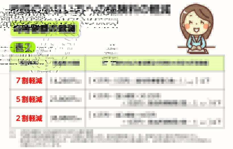世帯の所得により、最大7割の軽減があります。軽減には、7割のほか、5割、2割の軽減があります。