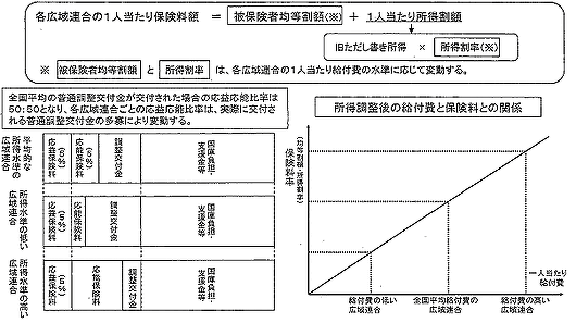 この制度の保険料のしくみは、法令により全国一律に決められています。このようなしくみでは、所得の全国格差がある場合、所得の低い県では、加入者一人あたりの負担が相対的に増加してしまいます。