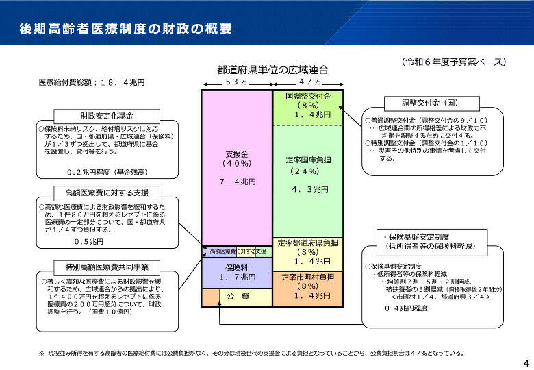 制度発足当初から現在まで、後期高齢者医療制度における保険料は保険給付の1割、現役世代が負担する後期高齢者支援金(若人の保険料が財源)は、約4割となっています。