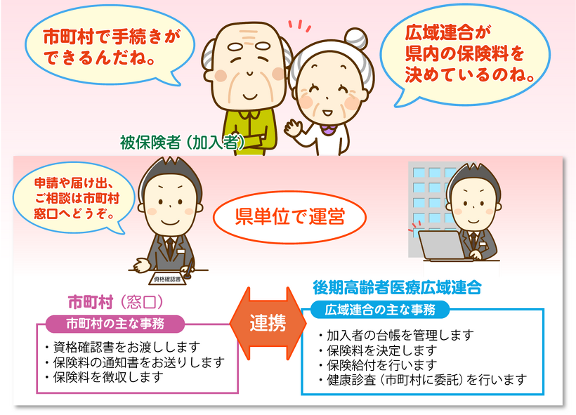 広域連合は保険財政の運営を担い、市町村は保険料の徴収や窓口業務を担います